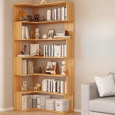 연구를위한 현대 다층 책장 단단한 나무 코너 스토리지 책장 라이트 럭셔리 도서관을위한 간단한 가정용 책장